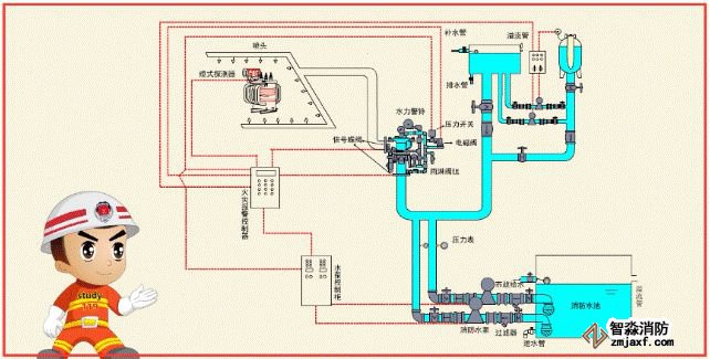 干式系統(tǒng)的啟動原理與濕式系統(tǒng)相似,只是將傳輸噴頭開放信號的介質(zhì)由有壓水改為有壓氣體。