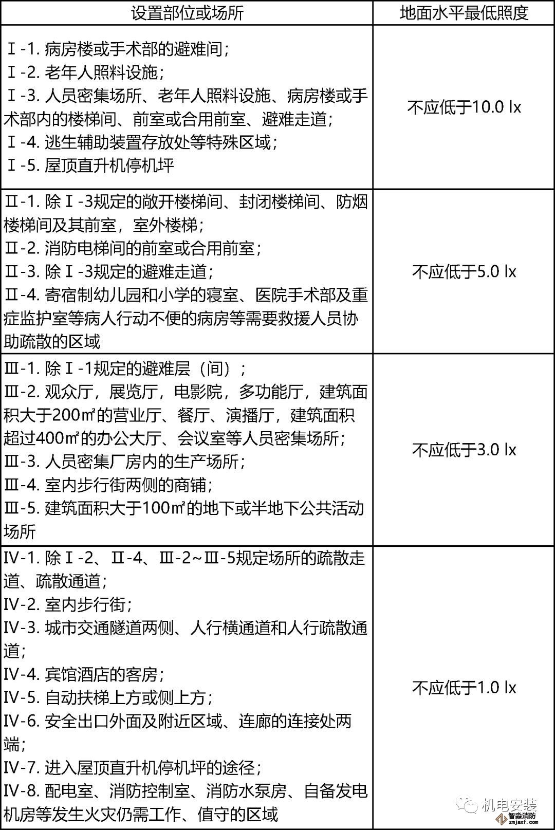 2)對(duì)于人員密集場(chǎng)所、避難層(間),不應(yīng)低于3.0lx;對(duì)于老年人照料設(shè)施、病房樓或手術(shù)部的避難間,不應(yīng)低于10.0lx。
