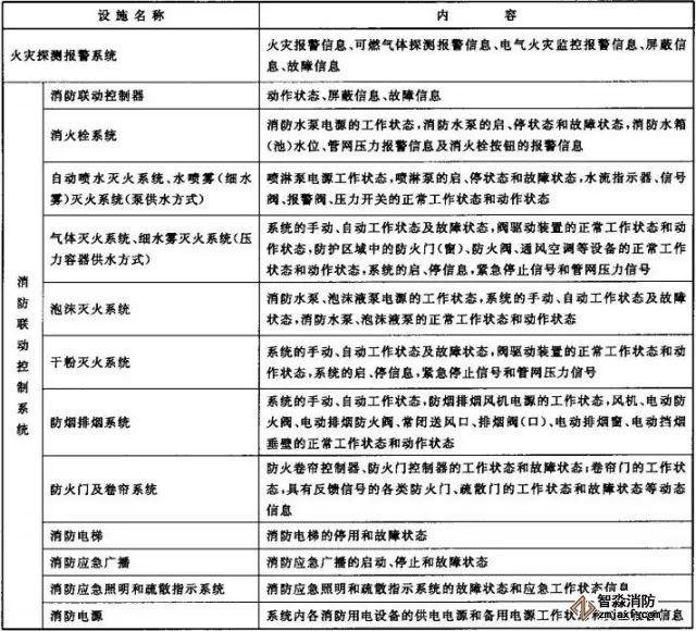 2、消防控制室內設置的消防設備應能監(jiān)控并顯示建筑消防設施運行狀態(tài)信息,并應具有向城市消防遠程監(jiān)控中心(以下簡稱監(jiān)控中心)傳輸這些信息的功能。建筑消防設施運行狀態(tài)信息見下表1。