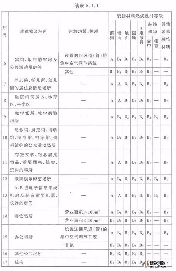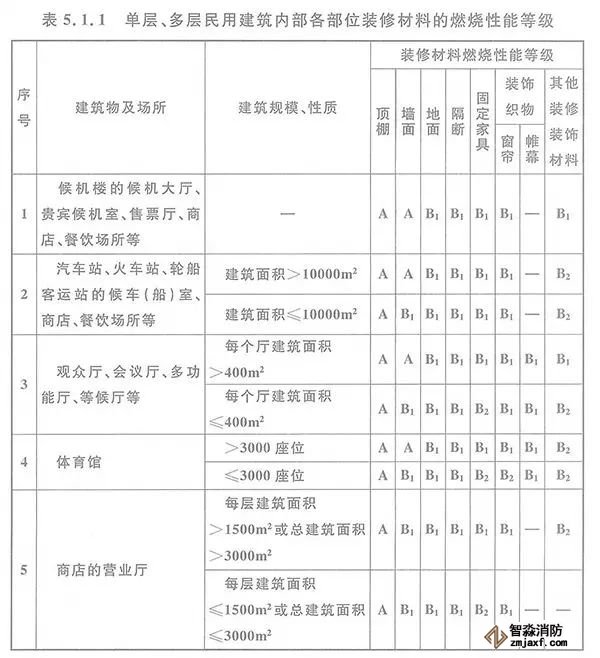 5.1.1 單層、多層民用建筑內(nèi)部各部位裝修材料的燃燒性能等級(jí),不應(yīng)低于本規(guī)范表5.1.1的規(guī)定。