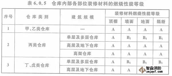 6.0.5 倉(cāng)庫(kù)內(nèi)部各部位裝修材料的燃燒性能等級(jí),不應(yīng)低于本規(guī)范表6.0.5的規(guī)定。