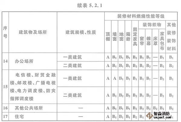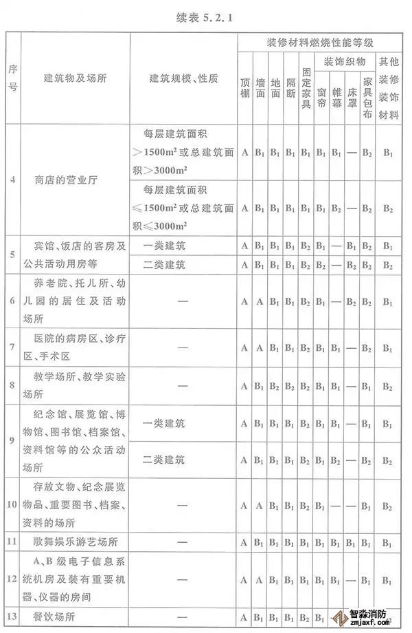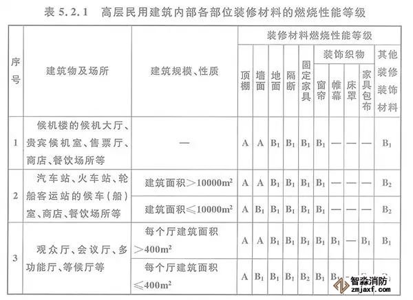 5.2.1 高層民用建筑內(nèi)部各部位裝修材料的燃燒性能等級(jí),不應(yīng)低于本規(guī)范表5.2.1的規(guī)定。