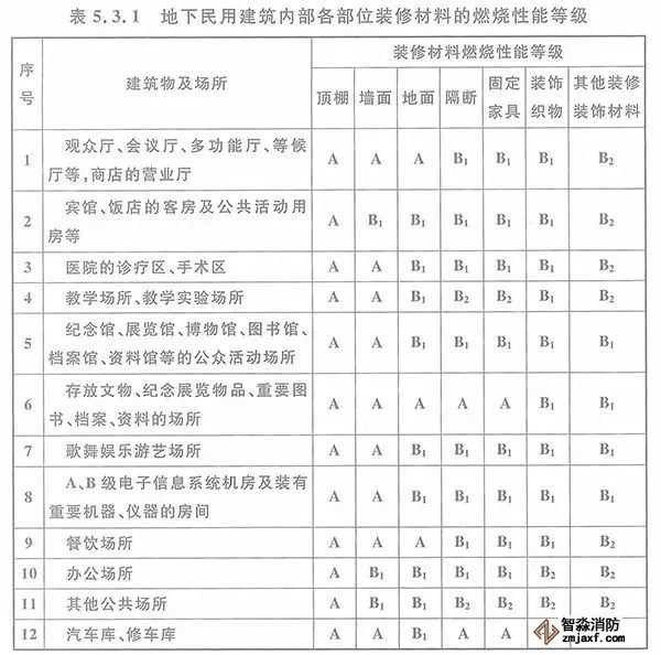 5.3.1 地下民用建筑內(nèi)部各部位裝修材料的燃燒性能等級(jí),不應(yīng)低于本規(guī)范表5.3.1的規(guī)定。