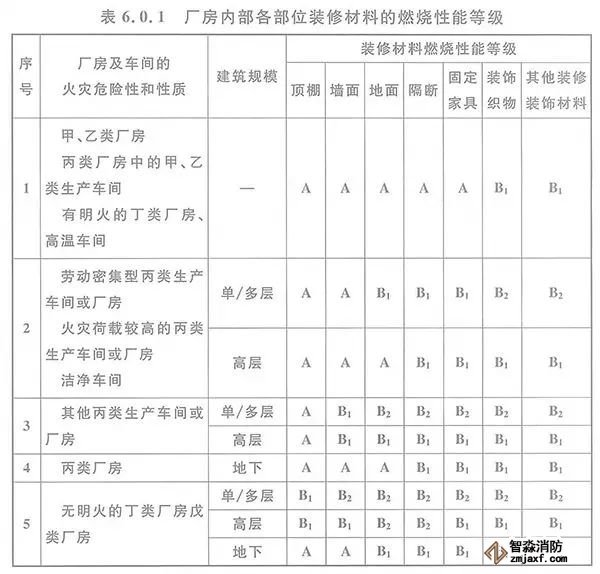 6.0.1 廠房?jī)?nèi)部各部位裝修材料的燃燒性能等級(jí),不應(yīng)低于本規(guī)范表6.0.1的規(guī)定。