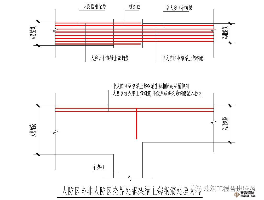 1)人防區(qū)內(nèi)梁板配筋圖紙一般由人防院設(shè)計,但模板關(guān)系(如洞口定位,梁定位、標(biāo)高)由民用院模板圖表達,所以梁板配筋應(yīng)結(jié)合兩院圖紙施工。