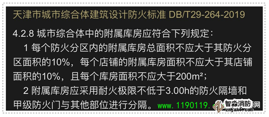 2、對于較大面積的商店建筑附屬庫房,應采取更嚴格的防火分隔措施,以下標準可供參考: