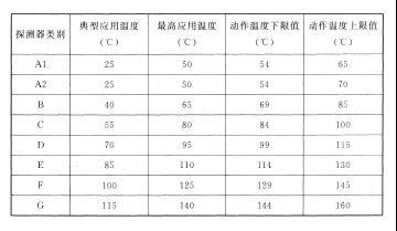 注:表中A1、A2、B、C、D、E、F、G為點(diǎn)型感溫探測(cè)器的不同類別,其具體參數(shù)應(yīng)符合附錄一的規(guī)定。