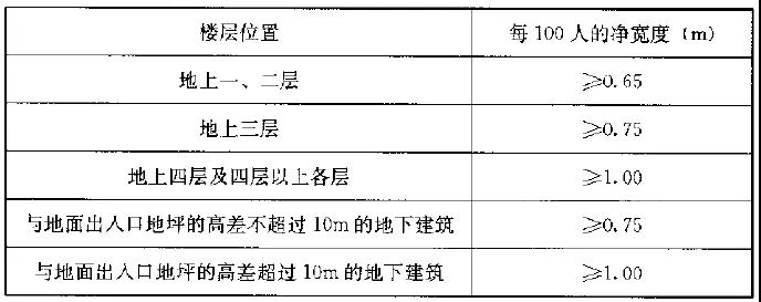 (1)每層安全出口、疏散樓梯的凈寬應(yīng)按下表的規(guī)定經(jīng)計(jì)算確定;當(dāng)每層人數(shù)不等時(shí),疏散樓梯的總寬度可分層計(jì)算,下層樓梯的總寬度應(yīng)按其上層人數(shù)最多一層的人數(shù)計(jì)算;