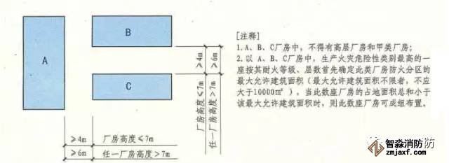 除高層廠房和甲類廠房外,其他類別的數(shù)座廠房占地面積之和小于本規(guī)范第3.3.1條規(guī)定的防火分區(qū)最大允許建筑面積(按其中較小者確定,但防火分區(qū)的最大允許建筑面積不限者,不應(yīng)大于10000㎡)時(shí),可成組布置。當(dāng)廠房建筑高度不大于7m時(shí),組內(nèi)廠房之間的防火間距不應(yīng)小于4m;當(dāng)廠房建筑高度大于7m時(shí),組內(nèi)廠房之間的防火間距不應(yīng)小于6m。