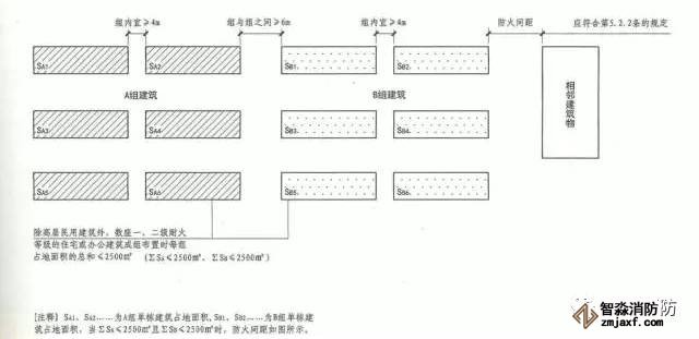 除高層民用建筑外,數(shù)座一、二級耐火等級的住宅建筑或辦公建筑,當(dāng)建筑物的占地面積總和不大于2500㎡時(shí),可成組布置,但組內(nèi)建筑物之間的間距不宜小于4m。組與組或組與相鄰建筑物的防火間距不應(yīng)小于本規(guī)范第5.2.2條的規(guī)定。