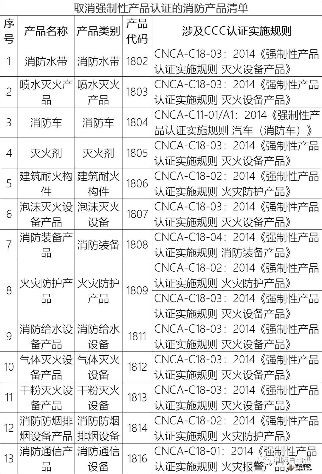 1、自即日起,我中心不再受理消防水帶、噴水滅火產(chǎn)品、消防車、滅火劑、建筑耐火構(gòu)件、泡沫滅火設備產(chǎn)品、消防裝備產(chǎn)品、火災防護產(chǎn)品、消防給水設備產(chǎn)品、氣體滅火設備產(chǎn)品、干粉滅火設備產(chǎn)品、消防防煙排煙設備產(chǎn)品、消防通信產(chǎn)品和部分火災報警產(chǎn)品(線型感溫火災探測器產(chǎn)品、消防聯(lián)動控制系統(tǒng)產(chǎn)品、防火卷簾控制器產(chǎn)品和城市消防遠程監(jiān)控產(chǎn)品)的強制性產(chǎn)品認證委托,統(tǒng)一注銷涉及上述產(chǎn)品的強制性產(chǎn)品認證證書,中止正在認證過程中的涉及上述產(chǎn)品的強制性產(chǎn)品認證工作。