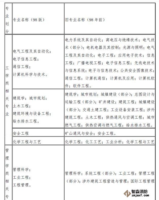 (一)取得消防工程專業(yè)大學??茖W歷,工作滿6年,其中從事消防安全技術(shù)工作滿4年;或者取得消防工程相關專業(yè)(見消防工程相關專業(yè)新舊對照表,下同)大學??茖W歷,工作滿7年,其中從事消防安全技術(shù)工作滿5年。