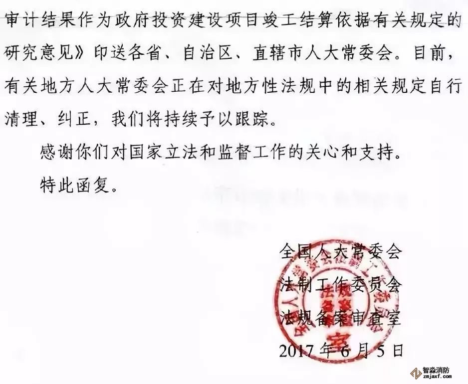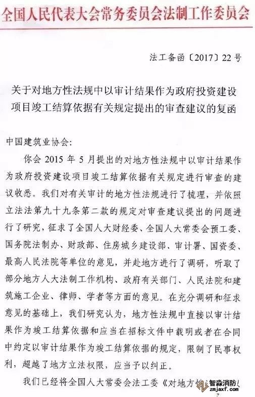 全國(guó)人大常委會(huì)法工委在回復(fù)中國(guó)建筑業(yè)協(xié)會(huì)《關(guān)于對(duì)地方性法規(guī)中以審計(jì)結(jié)果作為政府投資建設(shè)項(xiàng)目竣工結(jié)算依據(jù)有關(guān)規(guī)定提出的審查建議的復(fù)函》中提出,地方性法規(guī)中直接以審計(jì)結(jié)果作為竣工結(jié)算依據(jù)和應(yīng)當(dāng)在招標(biāo)文件中載明或者在合同中約定以審計(jì)結(jié)果作為竣工結(jié)算依據(jù)的規(guī)定,限制了民事權(quán)利,超越了地方立法權(quán)限,應(yīng)當(dāng)予以糾正。且法工委已將研究意見(jiàn)印送各省、自治區(qū)、直轄市人大常委會(huì)。目前,有關(guān)地方人大常委會(huì)正在對(duì)地方性法規(guī)中的相關(guān)規(guī)定自行清理、糾正。