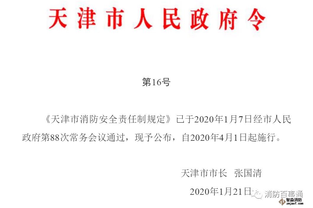 1月7日,天津市消防救援總隊聯(lián)合市應急局起草的《天津市消防安全責任制規(guī)定》經(jīng)天津市人民政府第88次常務會議審議,1月21日,市長張國清簽發(fā)第16號市政府令予以公布。