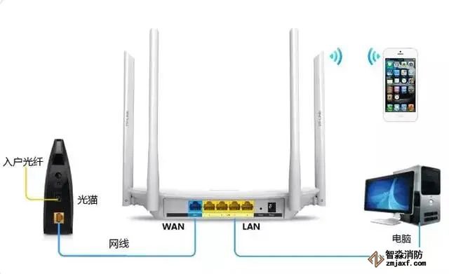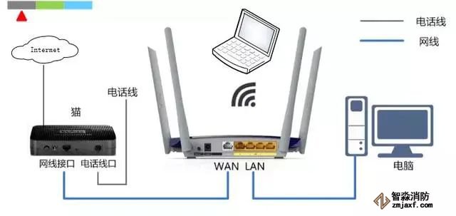 2. 和原來路由器連接,把原來有線路由器的網(wǎng)線接口連接到無線路由器的LAN接口,注意是LAN接口。
