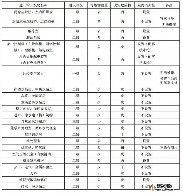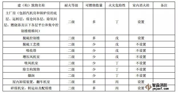 脫硫工藝樓,增壓風(fēng)機(jī)室,吸收塔,吸風(fēng)機(jī)室,屋內(nèi)高壓配電裝置(無(wú)油),除塵構(gòu)筑物,運(yùn)煤棧橋,運(yùn)煤隧道,油浸變壓器檢修間,油浸變壓器室,供、卸油泵房,油處理室,岸邊水泵房、中央水泵房,灰漿、灰渣泵房,生活消防水泵房,穩(wěn)定劑室、加藥設(shè)備室,進(jìn)水、凈水構(gòu)筑物,冷卻塔,化學(xué)水處理室,循環(huán)水處理室,啟動(dòng)鍋爐房,供氫站,推煤機(jī)庫(kù),消防車庫(kù),貯氫罐,空氣壓縮機(jī)室(有潤(rùn)滑油),熱工、電氣、金屬實(shí)驗(yàn)室,天橋,排水、污水泵房,各分場(chǎng)維護(hù)間,污水處理構(gòu)筑物,電纜隧道,材料庫(kù)棚,機(jī)車庫(kù),警衛(wèi)傳達(dá)室。