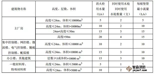 火力發(fā)電廠為工業(yè)建筑,為了便于操作,根據(jù)各建筑的內(nèi)部情況和火災(zāi)危險(xiǎn)性,明確了設(shè)置室內(nèi)消火栓的建筑物和場(chǎng)所。見(jiàn)表4。在電氣控制樓等帶電設(shè)備區(qū),應(yīng)配置噴霧水槍,增強(qiáng)消防人員的安全性。