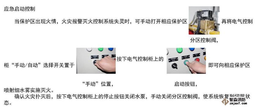當(dāng)保護(hù)區(qū)出現(xiàn)火情,火災(zāi)報(bào)警滅火控制系統(tǒng)失靈時(shí),可手動(dòng)打開相應(yīng)保護(hù)區(qū)分區(qū)控制閥,再將電氣控制柜“手動(dòng)/自動(dòng)”選擇開關(guān)置于“手動(dòng)”位置,按下電氣控制柜上的啟動(dòng)按鈕,即可向相應(yīng)保護(hù)區(qū)噴射細(xì)水霧實(shí)施滅火。