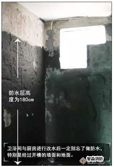 試壓完畢,繪制好給排水改造走向圖后,可以進行封槽。封槽后墻面與地面都必須做好防水,衛(wèi)浴間墻面的防水層高度應該做到180cm,廚房墻面的防水層高度做到50cm,做好墻面和地面的防水層,以防日后出現(xiàn)“表面冒汗”的情況。
