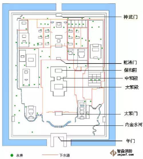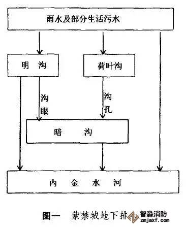 紫禁城排水系統(tǒng)總體規(guī)劃是東西方向的雨水匯入南北干溝,然后流入內(nèi)金水河。各個(gè)宮殿院落均設(shè)有干溝、支溝、明溝、暗溝、涵洞、流水溝眼等眾多排水設(shè)施。
