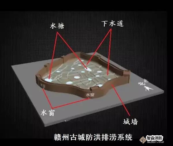 贛州古城防洪排澇系統(tǒng)分為4個(gè)部分:福壽溝、水塘、水窗、城墻