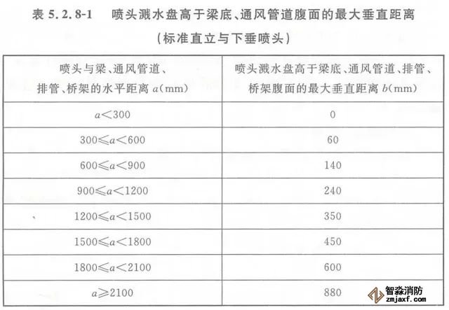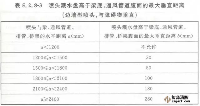 5.2.8 當(dāng)噴頭濺水盤高于附近梁底或高于寬度小于1.2m的通風(fēng)管道、排管、橋架腹面時(shí),噴頭濺水盤高于梁底、通風(fēng)管道、排管、橋架腹面的最大垂直距離應(yīng)符合表5.2.8-1~表5.2.8-9的規(guī)定(見圖5.2.8)。