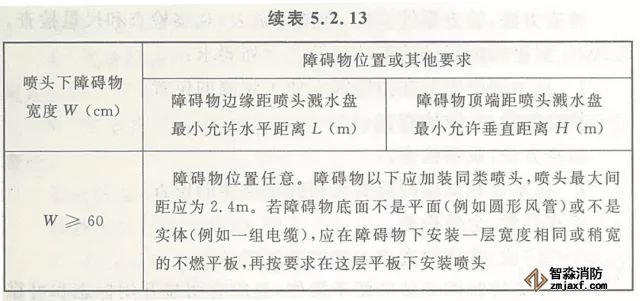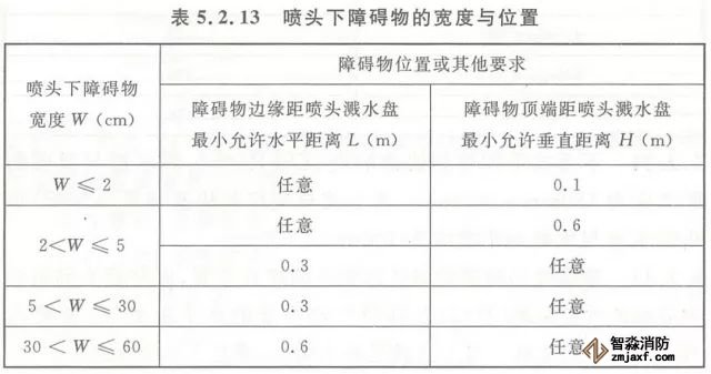 5.2.13 早期抑制快速響應(yīng)(ESFR)噴頭與噴頭下障礙物的距離應(yīng)滿足本規(guī)范圖5.2.12所示的要求。當(dāng)無(wú)法滿足要求時(shí),噴頭下障礙物的寬度與位置應(yīng)滿足本規(guī)范表5.2.13的規(guī)定。