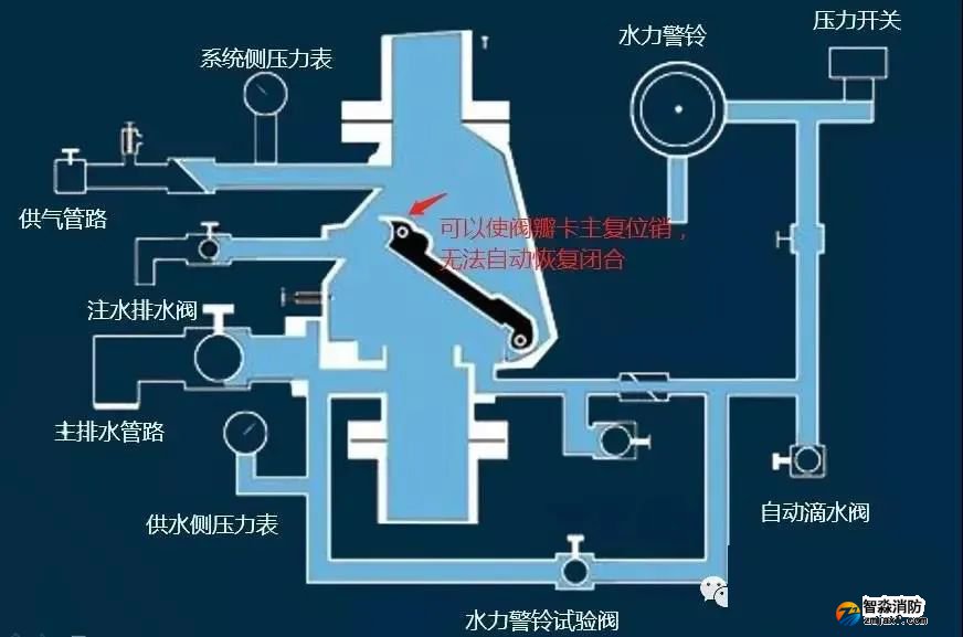 5)試驗(yàn)結(jié)束或者火災(zāi)撲救完之后,系統(tǒng)側(cè)的水全部從主排水管路排出(此時(shí)閥瓣仍是開(kāi)啟狀態(tài),被復(fù)位銷卡住無(wú)法返回)。