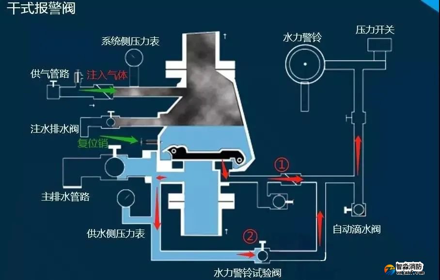 4)圖示路線②為報(bào)警管路測(cè)試管路,只需按照②路線開(kāi)啟水力警鈴試驗(yàn)閥,即可不開(kāi)啟閥瓣從而測(cè)試報(bào)警功能。