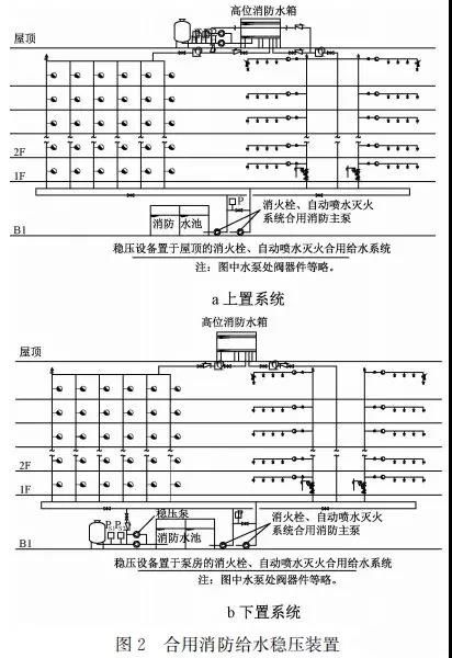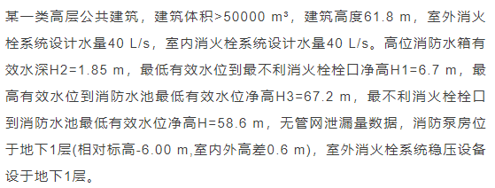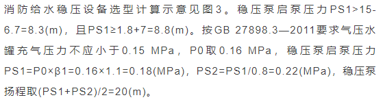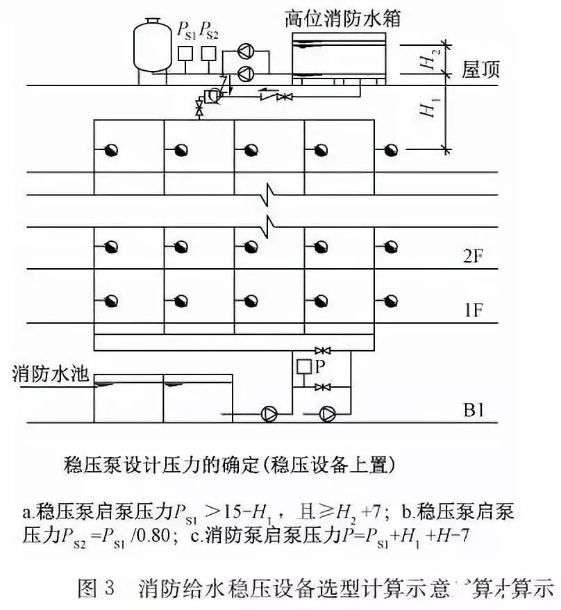 臨時高壓消防給水系統(tǒng)一般均應(yīng)設(shè)置高位消防水箱(除符合規(guī)范規(guī)定可不設(shè)的情形外),且對其設(shè)置高度有一定要求。日本規(guī)范規(guī)定自動噴水滅火系統(tǒng)屋頂消防水箱最不利的最低供水壓力為0.15 MPa,美國、英國規(guī)范則要求0.10 MPa。我國1987年版和2006年版“建規(guī)”對比均沒有規(guī)定,只在條文中要求重力自流的消防水箱應(yīng)設(shè)置在建筑的最高部位。1982年版《高層民用建筑設(shè)計(jì)規(guī)范》(以下簡稱“高規(guī)”)首次提出屋頂消防水箱應(yīng)滿足最不利消火栓的靜水壓力,但沒有提出設(shè)計(jì)參數(shù),1995年版“高規(guī)”做了具體規(guī)定。國標(biāo)圖集98S205編制目的是為解決臨時高壓消防給水系統(tǒng)高位消防水箱設(shè)置高度滿足不了系統(tǒng)最不利點(diǎn)靜水壓力時應(yīng)設(shè)增壓設(shè)施的要求,其為消防專用的增壓穩(wěn)壓設(shè)備的主要功能只是火災(zāi)初期時、消防主泵啟動前,確保具有足夠消防壓力的30 s儲水量進(jìn)行初期火災(zāi)撲救,直至消防主泵全負(fù)荷啟動運(yùn)行。這里更多的還是強(qiáng)調(diào)增壓的概念,設(shè)備類似于氣壓供水,發(fā)揮主要作用的是氣壓水罐,穩(wěn)壓水泵的作用是在3 min內(nèi),補(bǔ)足氣壓水罐內(nèi)實(shí)際穩(wěn)壓水容積。利用氣壓水罐所設(shè)定的P1、P2、PS1和PS2運(yùn)行壓力來控制穩(wěn)壓泵運(yùn)行工況。P1為根據(jù)計(jì)算求得消火栓系統(tǒng)或自動噴水滅火系統(tǒng)中最不利點(diǎn)所需的消防壓力作為氣壓水罐的充氣壓力。平時管道系統(tǒng)如有滲漏泄壓等情況,控制穩(wěn)壓水泵不斷補(bǔ)水穩(wěn)壓,在PS1、PS2(啟動-停止)反復(fù)運(yùn)行,一旦有火情,管道系統(tǒng)大量缺水,造成PS1下降(PS1→P2),降至P2時,立即啟動消防主泵。