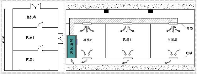 如下圖所示,若三個房間從吊頂?shù)降匕宥疾捎锚毩⒌目照{(diào)系統(tǒng),那么將機房1和機房2劃作一個區(qū)域或劃為兩個單獨滅火區(qū)都是可行的。但如果采用一臺精密空調(diào)為三個房間服務且為“上送風,地板下回風”方式這三個房間就必須劃分成一個滅火區(qū)域,藥劑儲備應該是上者的3倍或1.5倍,對工程的投資影響是比較大的。除過滅火劑和噴放管道布置要作為一個保護區(qū)考慮外,探測范圍也應該分塊進行探測但還是一個探測區(qū)域,警報區(qū)域也應該按照一個區(qū)域來設置和聯(lián)動。