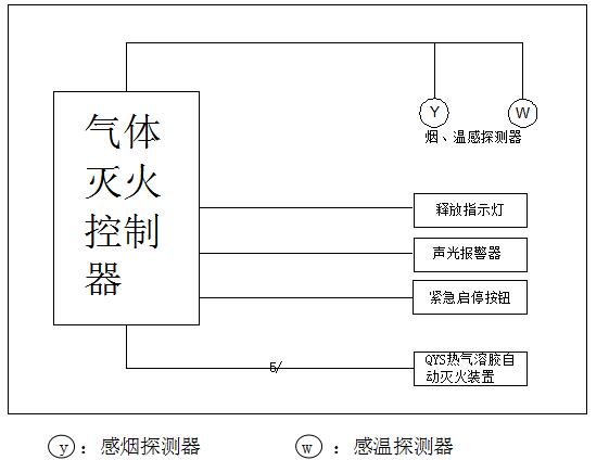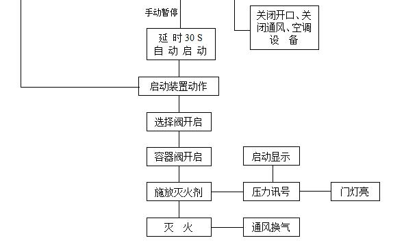 發(fā)生火災時,當一路探測器報警后,設在該防護區(qū)域內(nèi)的警鈴動作;兩路探測器都報警后,設在該防護區(qū)域內(nèi)外的蜂鳴器及閃燈動作;系統(tǒng)進入延時階段,控制盤完成相關設備的聯(lián)動控制。經(jīng)過延時后,控制盤輸出24V直流信號電源啟動儲氣瓶組上的電磁閥,打開儲氣瓶組釋放滅火劑氣體,滅火劑沿噴射短管和噴頭輸送到防護區(qū)域滅火。如值班人員先于火災探測系統(tǒng)發(fā)現(xiàn)火情,當用手提式滅火器或其它移動式滅火設備無法撲滅火災時,可直接手動啟動來滅火。如發(fā)現(xiàn)是系統(tǒng)誤動作,或確有火災發(fā)生但僅使用手提式滅火器和其它移動式滅火設備即可撲滅火災,可按下設在防護區(qū)域門外的緊急止噴按鈕,可以使系統(tǒng)暫時停止釋放藥劑。如需繼續(xù)開啟氣體滅火系統(tǒng),則只需松開緊急停止開關即可。